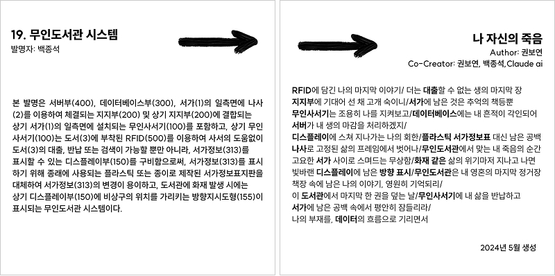사건이 되려는 시, 어지러운 과정을 겪는 시, 확률로 말하는 시, 기계가 대신 쓰는 시, 독창적이지도 않은 시, 읽지 않아도 되는 시, 심지어 쓰지 않아도 되는 시. 그간 시에 대해 배운 바에 따르면 「자리바꿈」은 좋은 시는커녕, 시가 아님 항목에 분류되어야 마땅하다. 시가 무엇인지, 어떻게 쓰고 읽는지를 아는 진중한 이가 무인도서관 시스템을 첫사랑 맥락으로 자리바꿈한 시 한편을 떼어 읽었다고 가정하자. 그는 특허 기술의 내용에 묶여있던 말이 AI의 힘으로 어디론가 떠난 사건 보다, 억지 맥락에 시어를 끼어맞춘 기계의 서툰 솜씨가 거슬린 것이다. 또한 그가 창작가의 권리를 중시한다면 특허 발명가들이 알지도 못하는 사이에 공동 창작자로 이름이 올라간 것을 문제 삼을 수도 있다. 인정한다. 나와 AI는 시간을 들여 조용히 감상할만한 좋은 시를 만드는데 실패했다. 그리고 좋은 시가 되지 못함으로 인해 개념적 쓰기 「자리바꿈」은 성공적이다. 좋은 시 되기에 실패하기를 바라고, 더 많은 이들이 함께 사건에 휘말리기를 원하는 걸 보니, 나는 나쁜 시인인 것 같다. 왜 어지러워지려 하는가. 그것은 익숙한 인간 언어와 기존 문학의 관습을 벗어날 때 탐험 가능한 낯선 세계를 향한 해방 욕구와 관련이 있다. 미지의 세계로 나아가려면 새로운 문학, 새로운 시인, 새로운 독자 발명에 필요한 도구가 필요하다. 예술가들은 AI를 특별한 도구로 전용해야 한다.