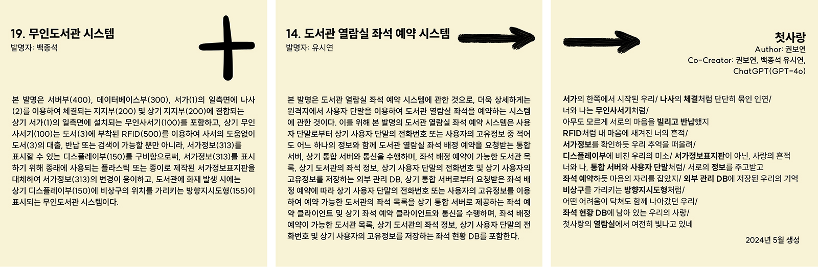 「자리바꿈: From Library To Somewhere (2024~)」는 한 언어가 최초 생산자A로부터 지시받은 고정 좌표를 무력화하여, AI를 이용해 다른 맥락으로 무단 재배치하는 개념적 쓰기 작업이다.12) 복사, 붙여넣기라는 비창의적 방법에 의해 원래 자리를 이탈한 언어는 기존의 정서, 기억, 방향, 감각이 부여한 고유함을 쉽게 잃는다. AI는 기계가 인식하는 사전적, 확률적 정보에 의한 자리바꿈을 수행하며, 예전의 의미와 가치를 함께 이동시키지 않기 때문이다. 작업 목표는 최초 생산자A가 정한 언어A′를 가능한 멀리 맥락 이동 시켜 언어A″를 더 새로운 감각에 정렬 시키는 것이다. 자리바꿈을 하더라도 언어 A′와 A″는 모두 주인 있는 말이다. 언어의 주인A는 개념적 쓰기를 시도하는 이와 더불어, 그의 의도와 상관없이 AI 개념시 「자리바꿈」의 공동 창작자가 된다. 「자리바꿈」의 바탕 언어는 2013년부터 10년간 국가 특허정보시스템 (KIPRIS)에 등록된 ‘도서관’ 관련 특허 26건이다.13) 바탕 언어 조합을 싱글, 듀엣, 앙상블, 심포니로 유형화 하고, ‘첫사랑’부터 ‘나 자신의 죽음’에 이르는 26개 이동 맥락과 매칭 한다. AI 문학기계는 언어 조합과 이동 맥락을 연결해 특허문서의 원래 의미를 해체하고 확률 언어의 감각으로 새로운 시를 생성하는 것이다. 작업 1부 ‘싱글’에서는 특허와 이동 맥락을 일대일로 연결한다. 이 경우, 1회 생성으로 탄생 가능한 시는 676 편이다. 2부 듀엣은 특허문서 1과 2, 2와 3처럼 두 개씩 짝지은 언어 조합을 26개 맥락으로 재배치시켜 8,540편의 변화를 일으킬 수 있다. 3부 앙상블은 3~5개 이하 기술 언어를 조합한 83,330 건이, 4부 심포니는 20~26개 조합에 의한 313,912개 언어 쌍이 이동 대상이 된다. 이 셈법에 따라 문학기계가 (26C1*26) + (26C2*26) + {(26C3+26C4+26C5)*26} + {(26C20+26C21+26C22+26C23+26C24+26C25+26C26)*26)}의 자리바꿈을 모두 마친다면, 완결된 책에는 특허청 문서에서 맥락 이동한 10,337,418 편의 AI 시가 채워질 것이다.